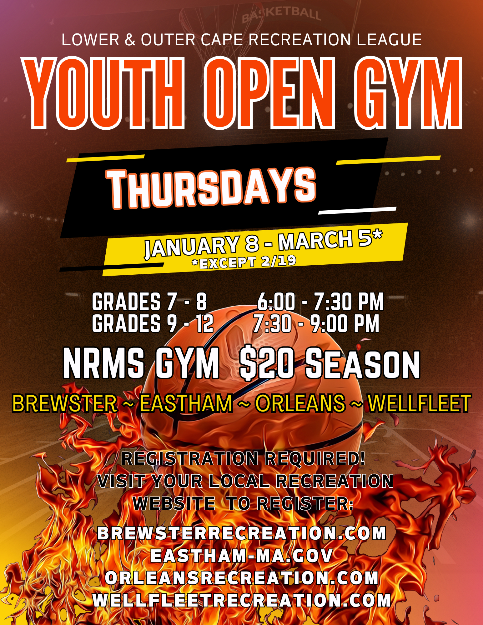Here’s your chance to join the Orleans Recreation Department, in collaboration with the towns of Brewster, Eastham, and Wellfleet, for exciting, organized pick-up basketball games! This program will take place at the NRMS Gym on Thursday nights, where you will play structured pick-up games alongside students from neighboring towns. This program will run from January to March.